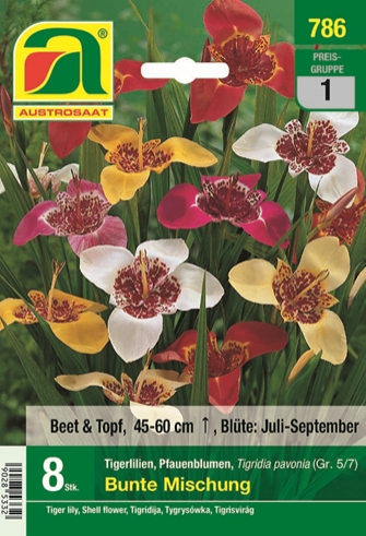Sortenbeschreibung:Die Tigerlilie, auch Pfauenblume genannt, bildet mehrere Blüten mit ca. 10-15 cm Durchmesser.