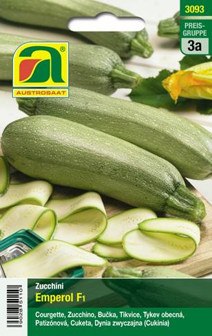 Hellgrüne, leicht gesprenkelte Zucchini. Ertragreich und sehr gut geeignet zum Ernten von jungen Früchten.