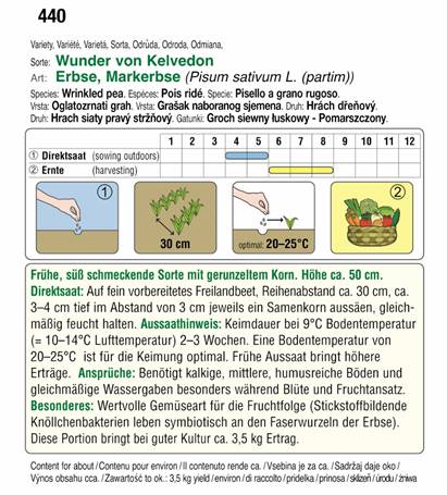 Erbsen zählen zu den leicht verdaulichen Hülsenfrüchten. Sie sind reich an pflanzlichem Eiweiß und Kohlenhydraten. Optimale Keimung bei 20-25°C Bodentemperatur.